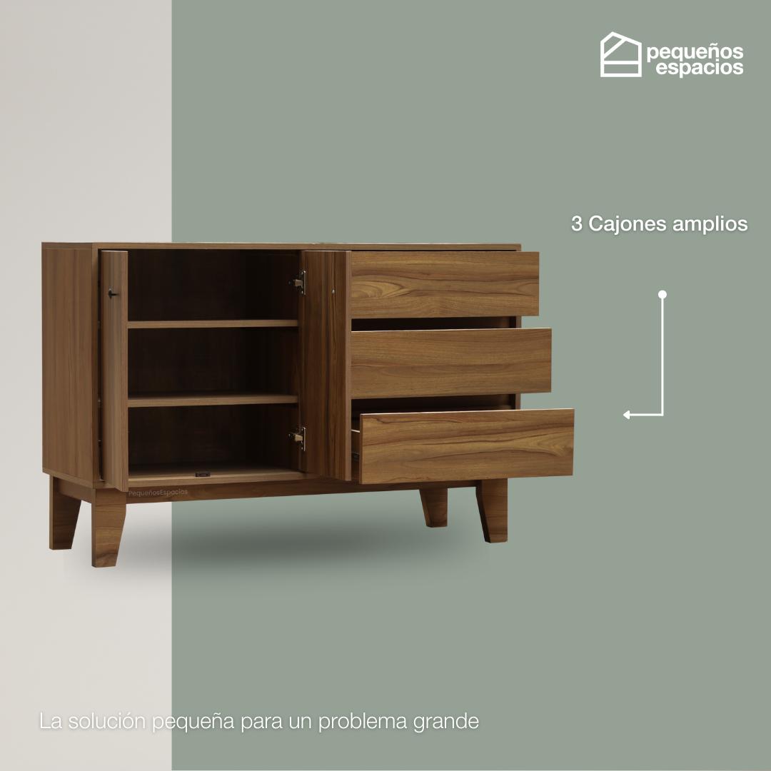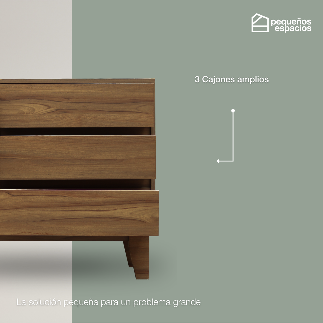 - Consta de tres cajones amplios y tres espacios abiertos, ofreciendo una excelente capacidad de almacenamiento para organizar tus objetos personales o decorativos.